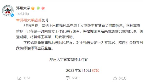 5月10日,郑州大学发布说明称,5月9日晚,网络上出现我校马克思主义学院王某某有关问题信息。学校高度重视,已在第一时间成立工作组进行调查,将根据调查结果依法依纪依规处理。调查期间,将暂停王某某一切教学活动。