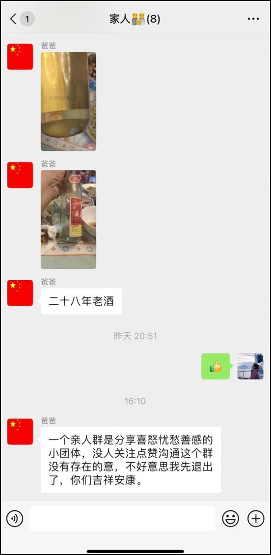 该网友还晒出父亲在群里的分享和退群前发的最后一段文字。