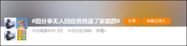 今天中午,#因分享无人回应爸爸退了家庭群#也冲上了热搜第一,引起了微博网友热烈讨论。