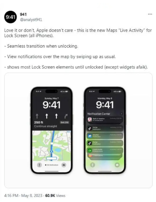 据站长之家引援国外媒体报道,此前,爆料人analyst941曾泄露了大量关于苹果iOS17的细节,包括对控制中心的大改、苹果地图锁屏细节、改进的Wallet和Health应用UI等。然而,最新报道称,analyst941的消息人士在一次行动中被苹果抓获,已被解雇并将面临法律诉讼。
