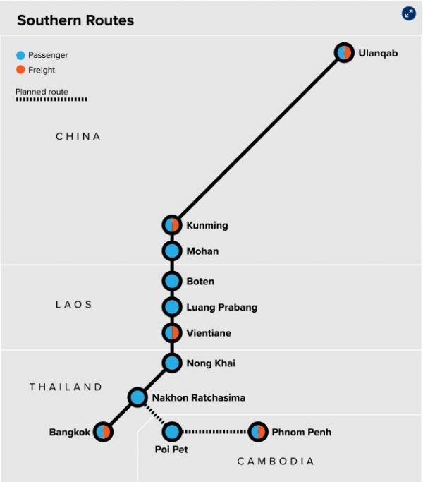 CNBC按区域绘制了上述铁路的建设和规划示意图,以中国为中心,分别取名为南线(与老挝、泰国相连,规划通往柬埔寨),东南线(规划与越南相连)。