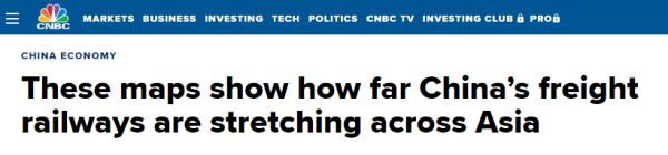 (观察者网讯)“这些地图展现了中国货运铁路在亚洲的延伸范围”,当地时间5月9日,美国消费者新闻与商业频道(CNBC)以此为题发布了一份中国参与建设的跨境货运列车线路在亚洲和欧洲的分布图,称这些铁路项目的建成展现了中国“一带一路”倡议的雄心是如何实现的。