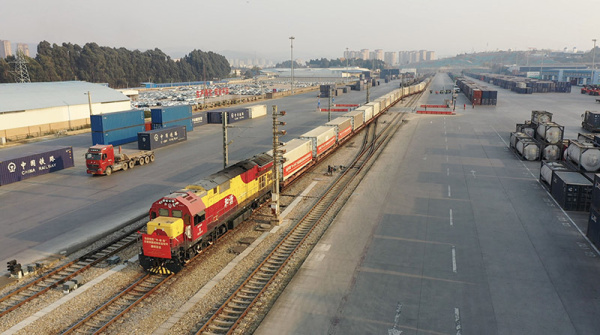 2023年2月7日,“中老泰”全程铁路运输往返班列首发列车从云南省中铁联集昆明中心站驶出(无人机照片)。新华社发