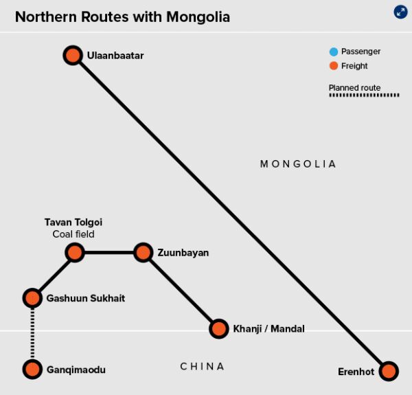 蒙古国宗巴彦至杭吉方向铁路于去年11月正式竣工。据相关部门估算,宗巴彦至杭吉方向铁路投入使用,并与中国境内包满铁路对接后,蒙古国不仅能实现每年进出口货物通关能力增加2000万吨,铁路运输货运总量增长65%,新增1300多个工作岗位,而且能节约运输成本和时间。