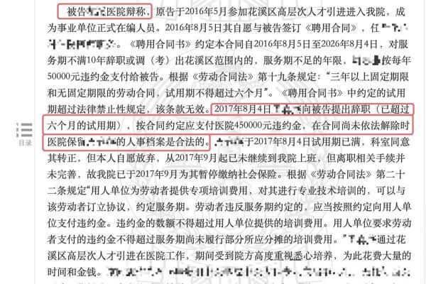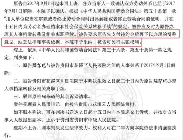 据悉,花溪区还曾有单位让离职员工先交45万元违约金,方可办理人事档案转移及相关离职手续,但法院未予支持。记者获取的一份法律文书显示,经花溪区高层次人才引进,被告花溪区某公立医院(甲方)于2016年8月5日与原告周某某(乙方)签订《贵州省事业单位人员聘用合同书》,合同期限自2016年8月5日起至2026年8月4日止,其中试用期至2017年8月4日止共12月。