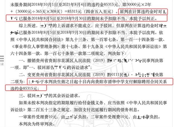 2020年11月,因不服花溪区人民法院判决,杨冈向贵阳市中级人民法院提起上诉。法院二审认为,杨冈、贵阳市清华中学在诉讼中均认可双方签订的《贵州省事业单位人员聘用合同书》,甲、乙方落款处的签名均系各自所签,且贵阳市花溪区教育局、贵阳市花溪区人力资源和社会保障局亦在该合同书鉴证机构落款处加盖公章,故该合同书系双方当事人的真实意思表示,且未违反法律、行政法规的强制性规定,该合同书合法有效。但原判在计算违约金时对杨冈已服务2018年8月5日至2018年9月30日的期间未予扣除不当,予以纠正。