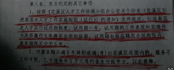 极目新闻记者从杨冈签订的《聘用合同书》第八条中看到,按照《花溪区人才工作协调小组办公室关于印发花溪区引进高层次人才工作实施细则(试行)的通知》文件规定,引进高层次人才实行试用期制度,试用期一年,试用期的工作表现和实绩,作为是否履行5年聘用合同的依据,试用期包括在聘用合同期限内,服务期限不少于5年。对服务期不满5年辞职或调(考)出花溪区范围内的,服务不足的年限,乙方按每年3万元违约金支付给甲方,以此类推。