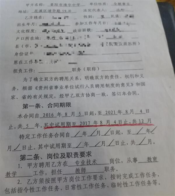 杨冈(化名)是一名硕士研究生,2015年毕业于国内一所211高校。次年,他通过贵州省人才博览会平台,经贵阳市花溪区高层次人才引进,自2016年8月5日起在贵阳市清华中学工作。