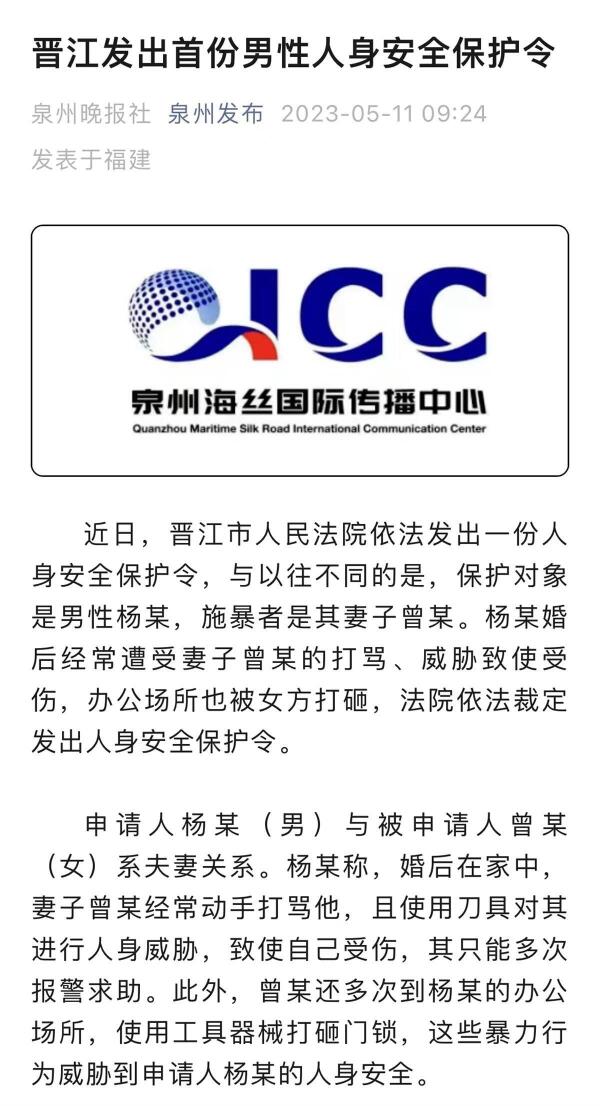 导读:据泉州发布5月11日报道,近日,福建泉州晋江市人民法院依法发出一份人身安全保护令,与以往不同的是,保护对象是男性杨某,施暴者是其妻子曾某。