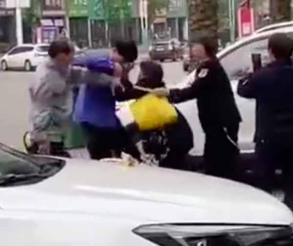 视频显示,一名身着城管制服的城管队员将老人三轮车上的物品扔掉,还把一个塑料瓶扔到了面前停靠的车上。老人拽住他的衣服不松手,另一名城管队员进行劝阻。