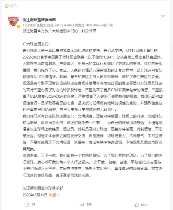 衷心感谢大家一直以来对我俱乐部和球队的支持、关心及爱护。5月10日晚上举行的2022-2023赛季中国男子篮球职业联赛(以下简称“CBA”)总决赛第二场比赛跌宕起伏,大家在主场群情激昂、声势震天,用自己的实际行动表达了对球队的支持。你们的肝胆相照,我们铭感于心。赛后,大家的心情还沉浸在激烈的比赛过程中,部分球迷对客队球迷表达了不满情绪。期间,警方和赛区工作人员积极疏导,维护了浙江赛区的安全。但还是有个别不理智的极端球迷在赛场外使用带有地域歧视的言论辱骂对方球员及球迷的言行严重伤害了对方的球员及球迷,严重伤害了更多CBA联赛参与者的情感,严重损害了CBA联赛和CBA球迷的形象,严重损害了大美浙江美丽杭州的形象。我俱乐部对歧视性言行一贯采取零容忍的态度,坚决反对任何带有地域歧视性的言论,并强烈谴责这种严重抹黑CBA联赛、抹黑大美浙江美丽杭州的无耻言行。