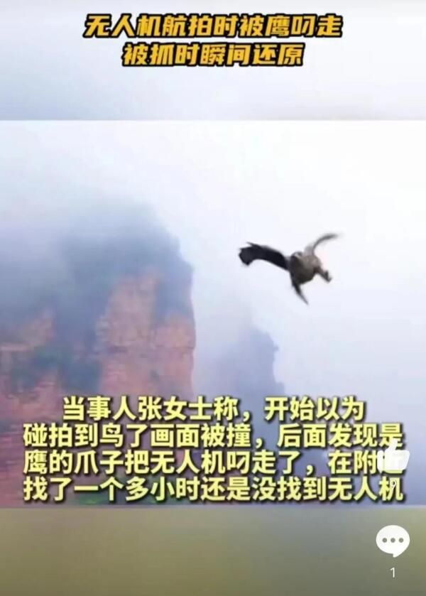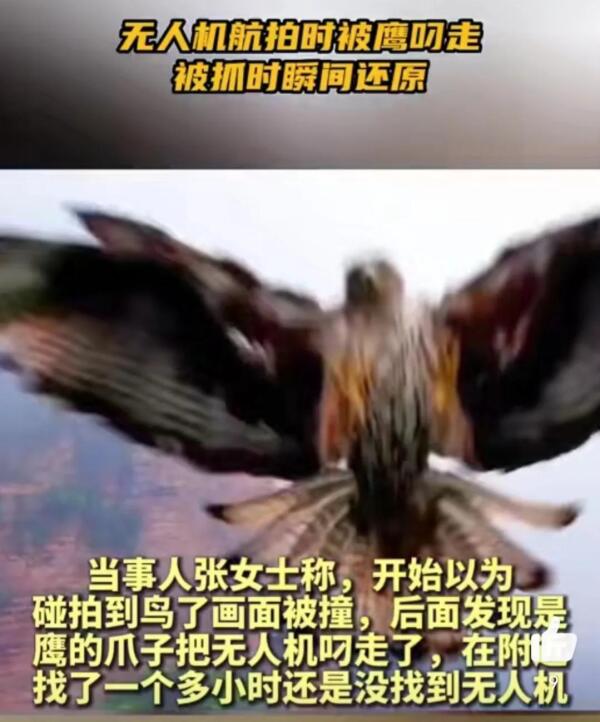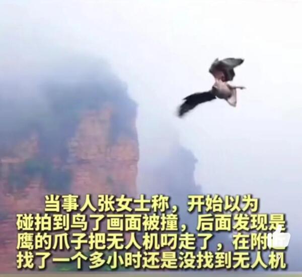 导读:近日,湖南张家界。张女士在航拍时,一只老鹰径直飞来将无人机叼走。张女士称以为是撞到鸟了,后面看回放发现是老鹰。