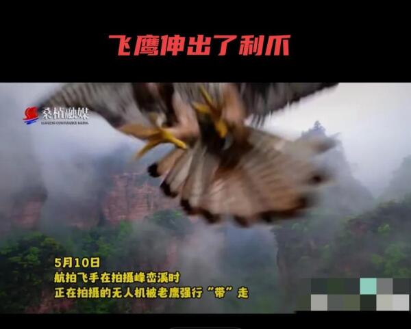 湖南桑植,一架无人机在航拍风景时,突然一只飞鹰以迅雷不及掩耳之势矫健掠过,然后无人机随着飞鹰一起消失了。