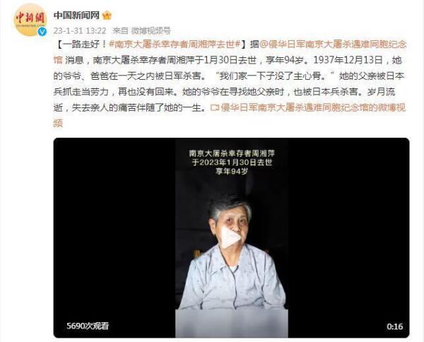 导读:据侵华日军南京大屠杀遇难同胞纪念馆消息,南京大屠杀幸存者周湘萍于1月30日去世,享年94岁。