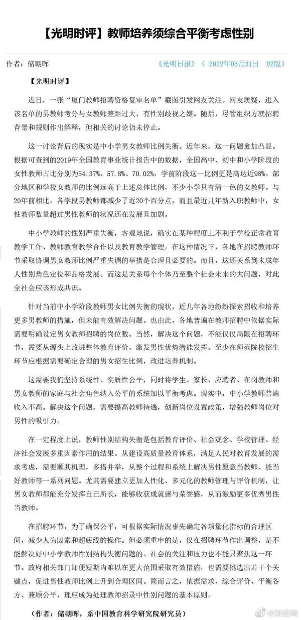 中小学教师的性别严重失衡,客观地说,确实在某种程度上不利于学校正常教育教学工作、教师教育教学合作以及教育教学管理。各地在招聘教师环节采取协调男女教师比例严重失调的举措是合理且必要的。而且,这还关系到未成年人性别角色定位和品格发展。