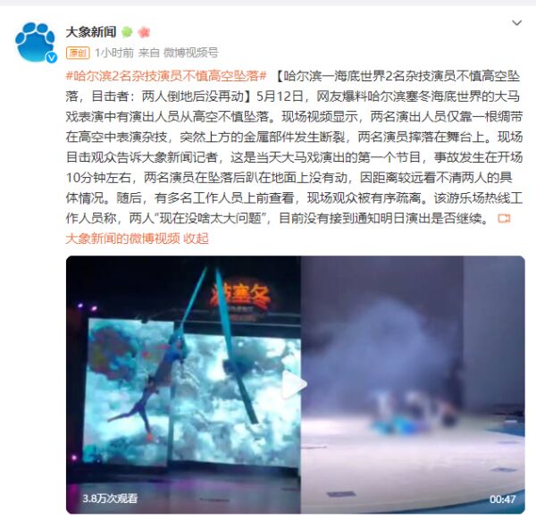 5月12日,网友爆料哈尔滨塞冬海底世界的大马戏表演中有演出人员从高空不慎坠落。现场视频显示,两名演出人员仅靠一根绸带在高空中表演杂技,突然上方的金属部件发生断裂,两名演员摔落在舞台上。现场目击观众告诉记者,这是当天大马戏演出的第一个节目,事故发生在开场10分钟左右,两名演员在坠落后趴在地面上没有动,因距离较远看不清两人的具体情况。