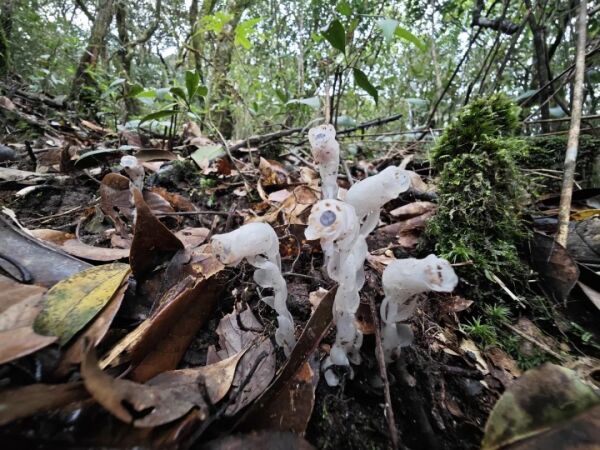 近日,在融水苗族自治县的元宝山上,护林员发现了一种罕见的植物——它们通体洁白如玉,无叶、无根、无香气,在暗光下发出晶莹剔透的诱人光泽,显得格外与众不同。经鉴定,这种植物为水晶兰,因其形态奇异、生境特殊,而被人们称为“幽灵草”“冥界之花”等。