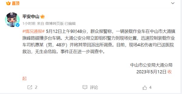 据平安中山报道:5月12日上午9时48分,群众报警称,一辆装载作业车在中山市大涌镇旗峰路碰撞多台车辆。大涌公安分局立即组织警力到现场处置,迅速控制装载作业车司机惠某(男,48岁)并将其带回派出所调查。目前,现场4名伤者均已送医院救治,无生命危险。事件正在进一步调查中。