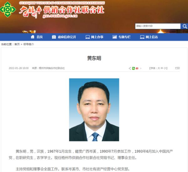 公开信息显示,黄东明,男,汉族,1967年1月出生,籍贯广西岑溪,1990年7月参加工作,1993年6月加入中国共产党,在职研究生,农学学士。现任梧州市供销合作社联合社党组书记、理事会主任。