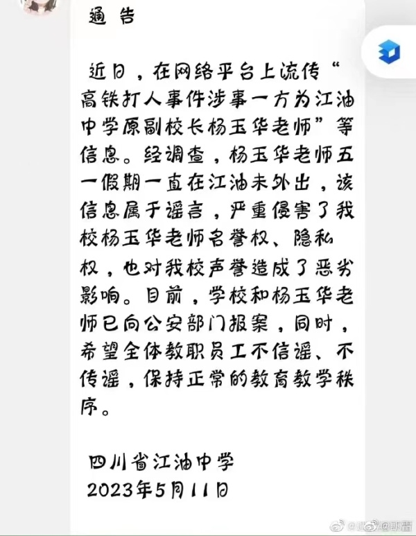 “五一”假期发生的高铁车厢打人事件近日持续引发热议。针对网传打人者之一为四川省江油中学教师一事,2023年5月11日,该校专门发布通告予以辟谣。