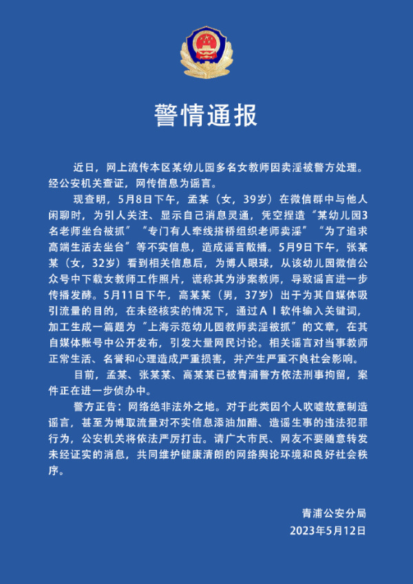 导读:5月12日,上海青浦公安通报“幼儿园多名女教师因卖淫被警方处理”:系谣言,3人因造谣已被依法刑事拘留,其中1人通过AI软件生成不实信息发布。
