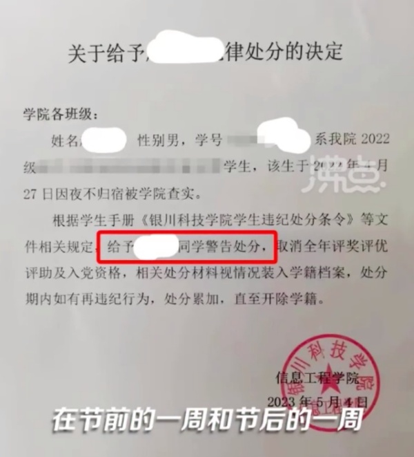 网传图片显示,学院给了该生处分的决定,称该生4月27日因夜不归宿被学院查实。取消全年评奖评优,相关处分情况视情况装入学籍档案。处分期内如有再违纪行为,处分累加,直至开除学籍。
