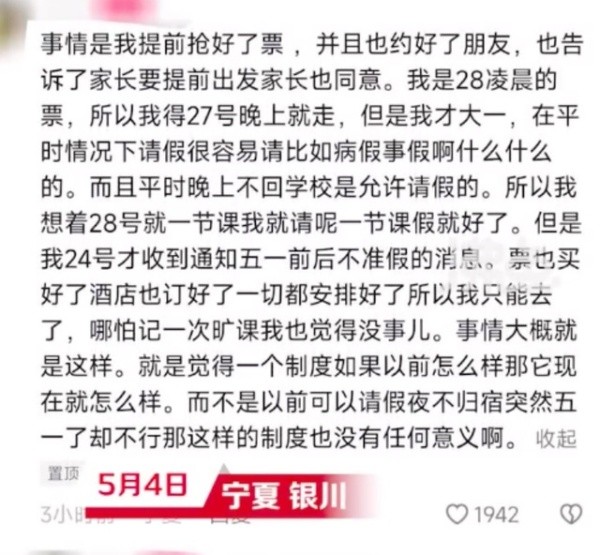 该学生还表示,“就觉得一个制度如果以前怎么样,那它现在就怎么样。而不是以前可以请假夜不归宿,突然五一了却不行,那这样的制度也没有任何意义啊”。