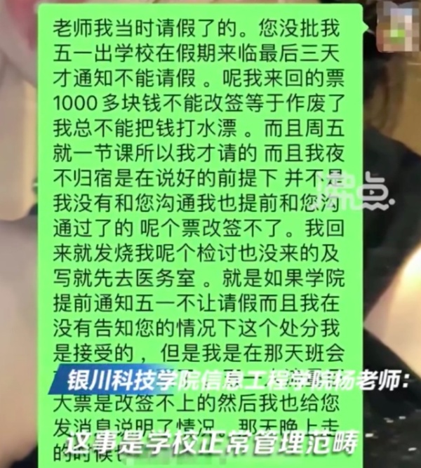 5日,银川科技学院信息工程学院杨老师回应表示,给处分是合情合理的,这是学校的正常管理范畴。该学生没有跟辅导员申请请假手续,直接离校。学校的规定是,节前的一周和节后的一周尽可能避免老师和学生请假,避免造成教学秩序混乱,但特殊情况除外。