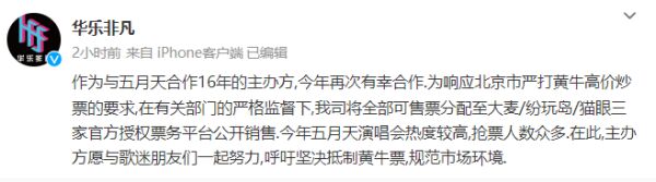 对此,一些五月天歌迷把矛头直指演唱会主办方华乐非凡。今日,主办方华乐非凡就此事进行了回应:“为响应北京市严打黄牛高价炒票的要求,在有关部门的严格监督下,我司将全部可售票分配至大麦、纷玩岛、猫眼三家官方授权票务平台公开销售。今年五月天演唱会热度较高,抢票人数众多。在此,主办方愿与歌迷朋友们一起努力,呼吁坚决抵制黄牛票,规范市场环境。”