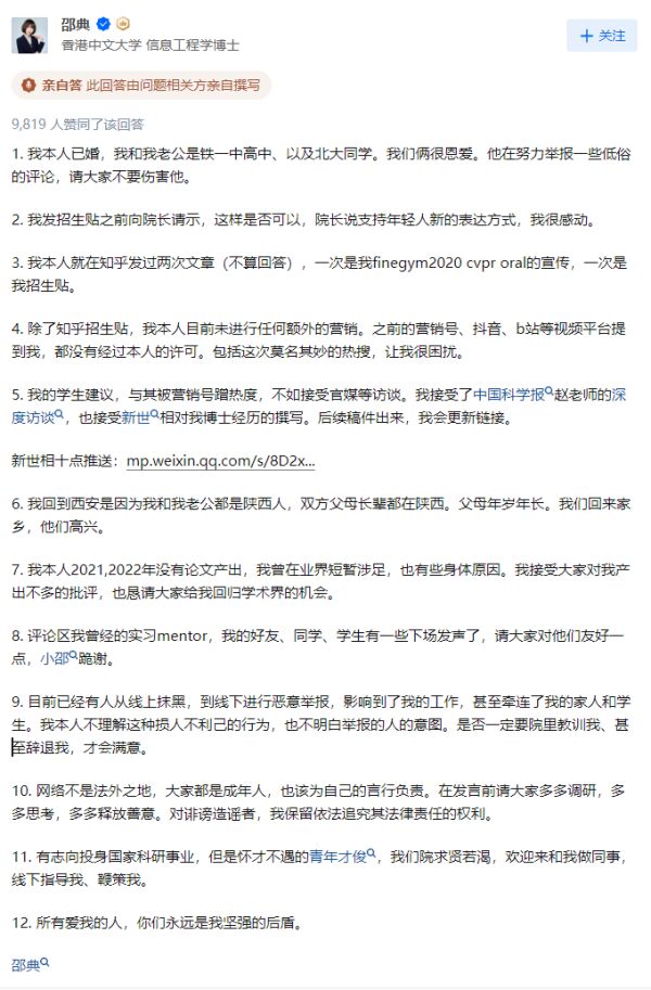 对于发布这一则招生信息,邵典透露,“我发招生贴之前向院长请示,这样是否可以,院长说支持年轻人新的表达方式,我很感动……除了知乎招生贴,我本人目前未进行任何额外的营销。之前的营销号、抖音、b站等视频平台提到我,都没有经过本人的许可。包括这次莫名其妙的热搜,让我很困扰”。