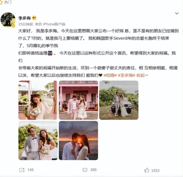 “大家好, 我是李多海。今天在这里想跟大家公布一个好消息,是不是有的朋友已经猜到什么了?对的,就是我马上要结婚了。我和韩国歌手Seven8年的恋爱⻓跑终于结束了,5月婚礼的季节,我们即将喜结连理。今天在这里以这种形式公开这个喜讯,希望得到大家的祝福。我们会带着大家的祝福开始新的生活,尽到一个做妻子做丈夫的责任,相互相亲相爱,相濡以沫,希望大家以后也继续支持我们爱我们。”