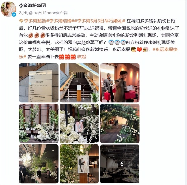 李多海粉丝团晒出多张图片写道:“ 在得知多多婚礼确切日期后,好几位骨灰级粉丝不远千里飞去送祝福,带着全国各地的粉丝送的礼物到达了首尔。多多得知后非常感动,主动邀请送礼物的粉丝到婚礼现场,共同分享这份幸福和喜悦,这样的双向奔赴你慕了吗?前方粉丝传来婚礼现场美图,太梦幻、太美丽了!祝我们多多新婚快乐!永远幸福!”