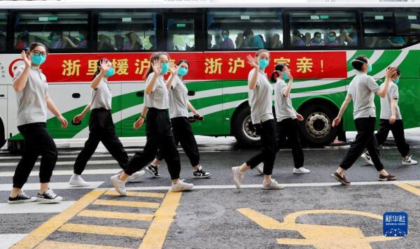 浙江省援沪医疗队队员列队走过停放在位于上海市浦东新区驻地外的大巴旁(5月24日摄)。当日,浙江省援沪医疗队圆满完成援沪任务启程返浙。新华社记者 方喆 摄