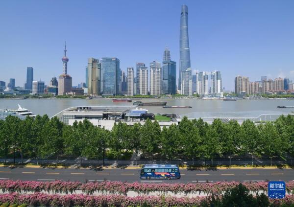 一辆载有援沪医疗队员的大巴车驶过上海外滩(5月5日摄)。新华社记者 李贺 摄