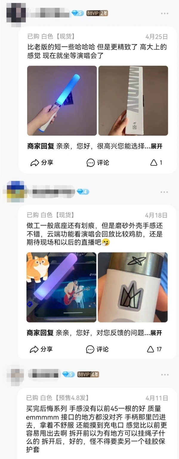 在商品评论区,粉丝们对新款荧光棒的评价各不相同。有人认为荧光棒颜值很高,比老款更加精致;也有人评价称做工一般,“越贵质量越差”“云端功能比较鸡肋”。