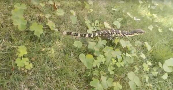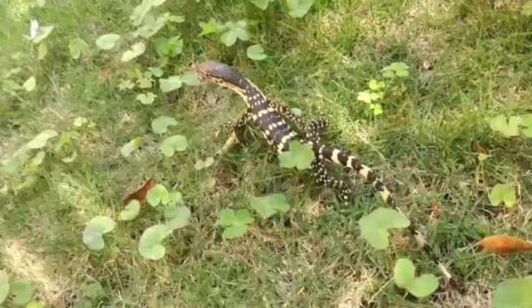 科研人员在跟踪拍摄过程中,圆鼻巨蜥感受到了威胁,随即摆出防守姿态,不断地吐舌头。经工作人员观察,此圆鼻巨蜥无受伤迹象,进食正常,可以直接让其回归大自然。