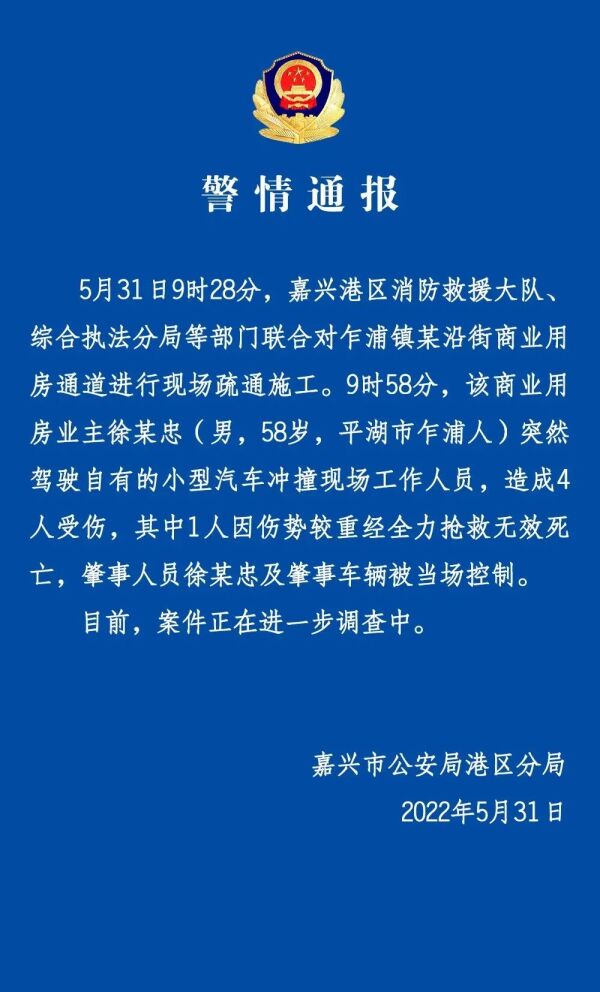 据浙江省嘉兴市公安局港区分局通报,5月31日9时28分,嘉兴港区消防救援大队、综合执法分局等部门联合对乍浦镇某沿街商业用房通道进行现场疏通施工。9时58分,该商业用房业主徐某忠(男,58岁,平湖市乍浦人)突然驾驶自有的小型汽车冲撞现场工作人员,造成4人受伤,其中1人因伤势较重经全力抢救无效死亡,肇事人员徐某忠及肇事车辆被当场控制。