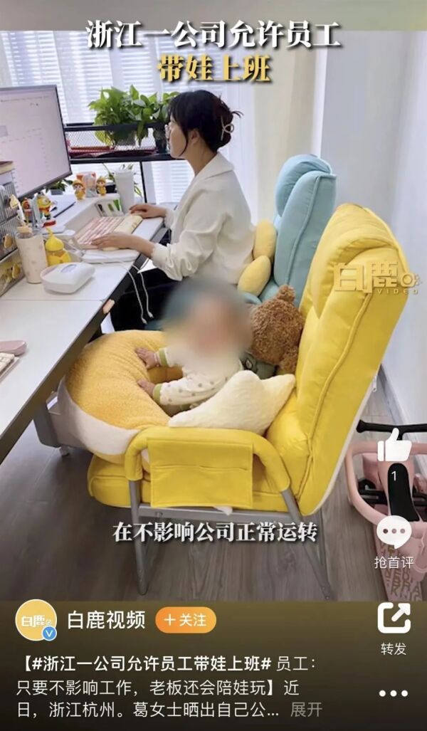 据白鹿视频5月14日报道,近日,浙江杭州。葛女士晒出自己公司允许员工偶尔带娃上班,引发网友热议。