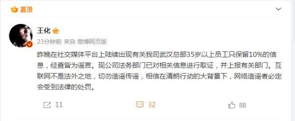 小米集团公关部总经理王化发布声明称,昨晚在社交媒体平台上陆续出现有关我司武汉总部35岁以上员工只保留10%的信息,经查皆为谣言。现公司法务部门已对相关信息进行取证,并上报有关部门。互联网不是法外之地,切勿造谣传谣,相信在清朗行动的大背景下,网络造谣者必定会受到法律的处罚。(中新经纬APP)