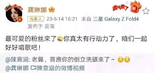 龚琳娜得知了陈意涵倒立洗头的事情,她直言陈意涵是她最可爱的粉丝,还夸陈意涵很有行动力,不会拖拖拉拉。