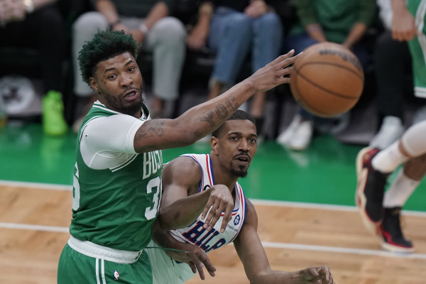 5月14日,波士顿凯尔特人队球员斯马特(左)在比赛中与费城76人队球员德安东尼·梅尔顿拼抢。新华社/美联