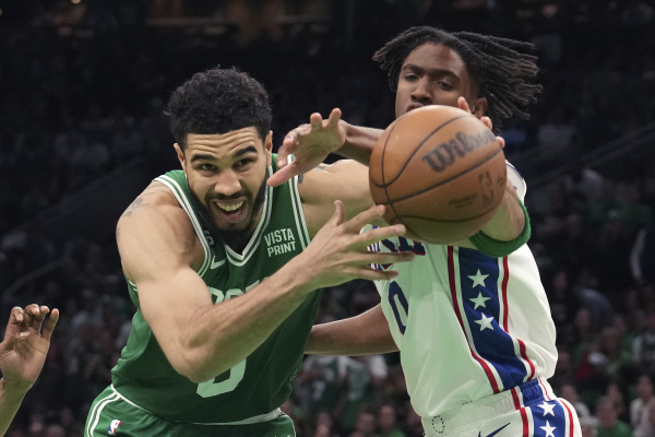 5月14日,波士顿凯尔特人队球员塔图姆(左)在比赛中与费城76人队球员马克西拼抢。新华社/美联