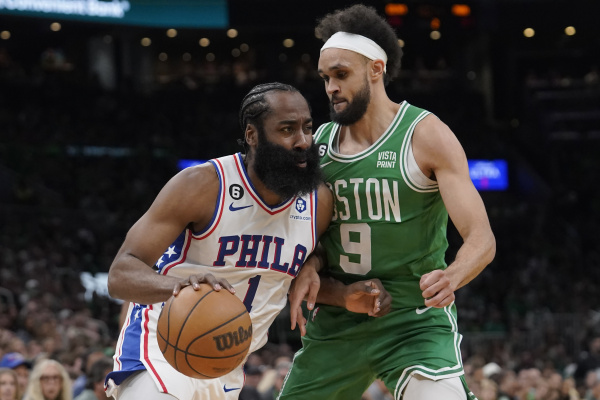 5月14日,费城76人队球员哈登(左)突破波士顿凯尔特人队球员怀特的防守。新华社/美联