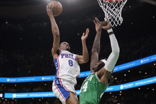 5月14日,费城76人队球员德安东尼·梅尔顿(左)在比赛中上篮。新华社/美联