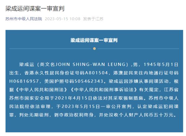 新京报讯 据苏州市中级人民法院微信公众号消息,梁成运(英文名JOHN SHING-WAN LEUNG),男,1945年5月1日出生,香港永久性居民身份证号码A801504,港澳居民来往内地通行证号码H06816957,美国护照号码505462343。梁成运因涉嫌从事间谍活动,根据《中华人民共和国刑法》《中华人民共和国刑事诉讼法》有关规定,江苏省苏州市国家安全局于2021年4月15日依法对其采取强制措施。苏州市中级人民法院经依法审理,于2023年5月15日一审公开宣判,认定梁成运犯间谍罪,判处无期徒刑,剥夺政治权利终身,并处没收个人财产人民币五十万元。