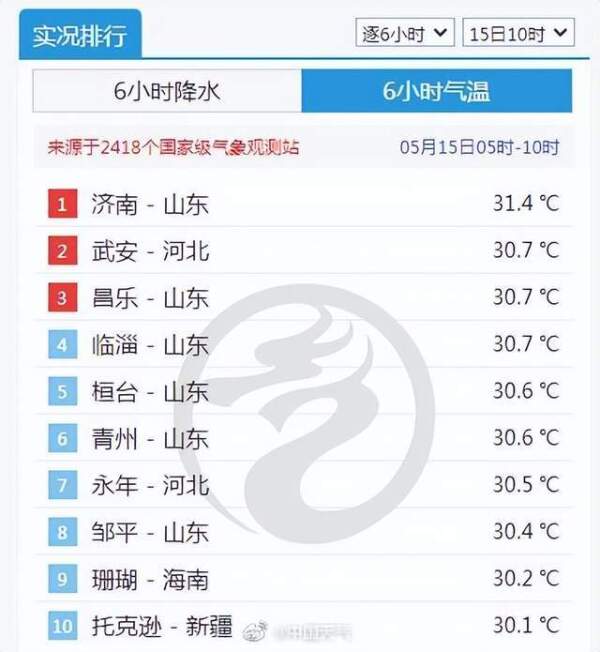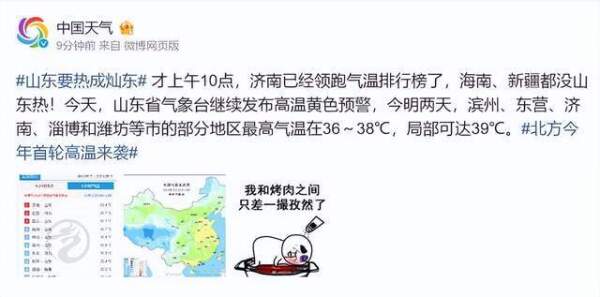 导读:5月15日,“山东要热成灿东”的话题引发热议。据中国天气微博消息,才上午10点,济南已经领跑气温排行榜。今明两天济南、淄博等市的局部气温可达39℃。