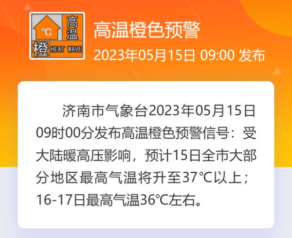 济南市气象台2023年5月15日9时发布高温橙色预警信号:受大陆暖高压影响,预计15日全市大部分地区最高气温将升至37℃以上;16-17日最高气温36℃左右。