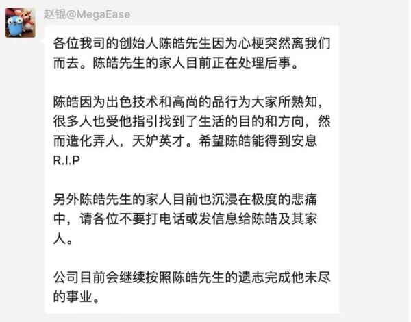 导读:5月15日,知名社交媒体发布称,MegaEase创始人、资深IT技术专家陈皓突发心梗离世,年仅47岁。