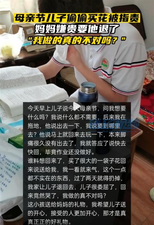 5月14日母亲节当天,浙江东阳一个男孩给妈妈买了一束花,想给妈妈一个惊喜,没想到却被妈妈指责,男孩委屈落泪,妈妈称:花一点都不实用,过两天就得扔掉,让儿子退回去。(据5月15日极目新闻《母亲节当天儿子买花送惊喜,妈妈嫌不实用要退回,儿子委屈落泪,网友:太扫兴了》)