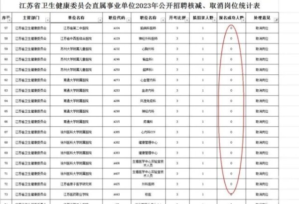记者还注意到,今年1月,江苏省卫生健康委员会发布直属事业单位2023年公开招聘工作人员部分岗位取消或核减公告称:据统计,有部分岗位达不到开考比例,需予以核减或取消。从官方发布的取消、核减岗位统计表来看,22个岗位被取消,18个岗位核减,38个岗位取消改报。从岗位要求来看,涉及的一些医院,如苏州大学附属第一医院、南通大学附属医院、徐州医科大学附属医院、南京医科大学第二附属医院,均为三甲医院。